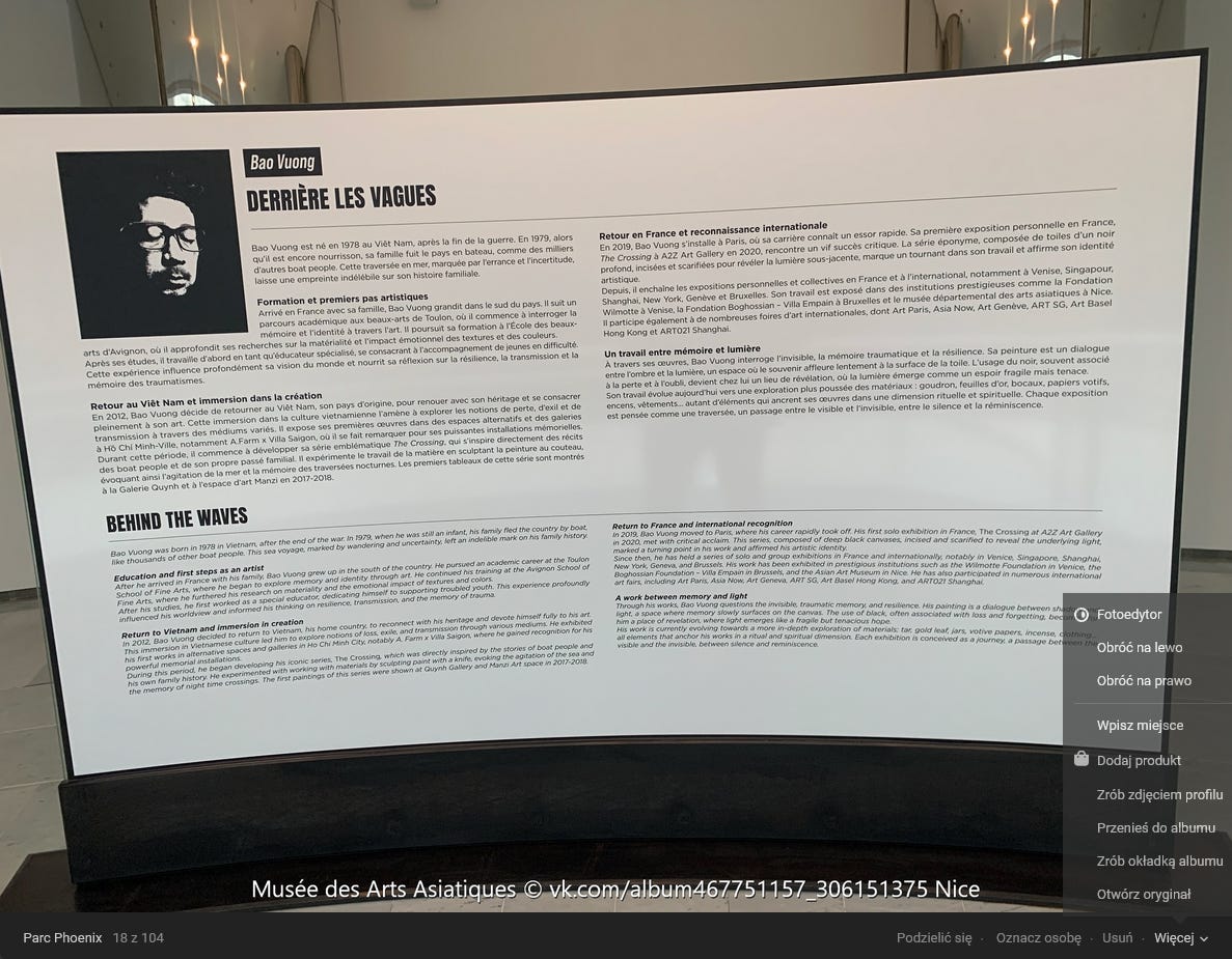 W Nicei są do 19 października 2025 r. wyeksponowane do obejrzenia bez opłat prace młodszego ode mnie o ćwierć wieku, młodego zatem stosunkowo, z mego punktu widzenia Wietnamczyka Bao Wuonga, którego ojciec na kilka lat przede mną zdecydował się w dramatycznych okolicznościach na ucieczkę z rodziną z własnej Ojczyzny. Dzisiaj Pani komisarz wystawy, Madame Simone Dibo-Cohen usiłuje nas przekonać do swojej Narracji Kuratora, w której urodzenie się Bao Wuonga (sytuowane na koniec lat ’70) oraz ucieczka jego ojca i matki z niespełna rocznym dzieckiem na ręku chciałyby mieć uzasadniony związek przyczynowy z promowaną przez Madame ponurą estetyką dzieł artysty. Tymczasem po wklepaniu do wyszukiwarki Google zapytania: „kiedy wojska USA wyszły z Wietnamu?”, otrzymujemy odpowiedź Sztucznej Inteligencji (Przegląd od AI): „Ostatnie amerykańskie oddziały wojskowe opuściły Wietnam Południowy 29 marca 1973 roku, po podpisaniu Porozumień Pokojowych z Paryża, które przewidywały ich wycofanie”.
