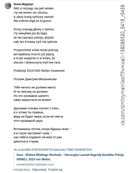 Nikt ci niczego nie jest winien./ I ty nie winien nic nikomu./ A zlany krwią cyrkowy namiot/ Nie zniknie stąd po kryjomu.// Drony zrywają głowy z ramion,/ I ty nawykłeś już do tego,/ że nie zaznasz pokoju, dopóki/ cały ten krwawy cyrk nie spłonie.// Przypomnisz sobie może później,/ jak będziesz mocno już pijany,/ a krzyk uwięźnie ci w krtani, że/ starzec i dziewczyna myli twe rany.// Przełożył 20251003 Stefan Kosiewski sowafrankfurt.substack.com/p/gaza-riwiera-bliskiego-wschodu-narracyjny Тебе ничего не должен никто./ И ты никому не должен./ Но это кровавое шапито/ само закрыться не может.// Дронами головы сносит с плеч,/ и к этому ты привык,/ ведь не будет мира, если не сжечь/ этот кровавый цирк.// Вспомнишь потом, когда будешь пьян –/ и в горле застрянет крик –/ как тебя в подвале/ лечили от ран/ девочка и старик.// Rosyjski tekst wiersza: vk.com/wall-158089520_5419 Dymitr Mielnikow/ Дмитрий Мельников